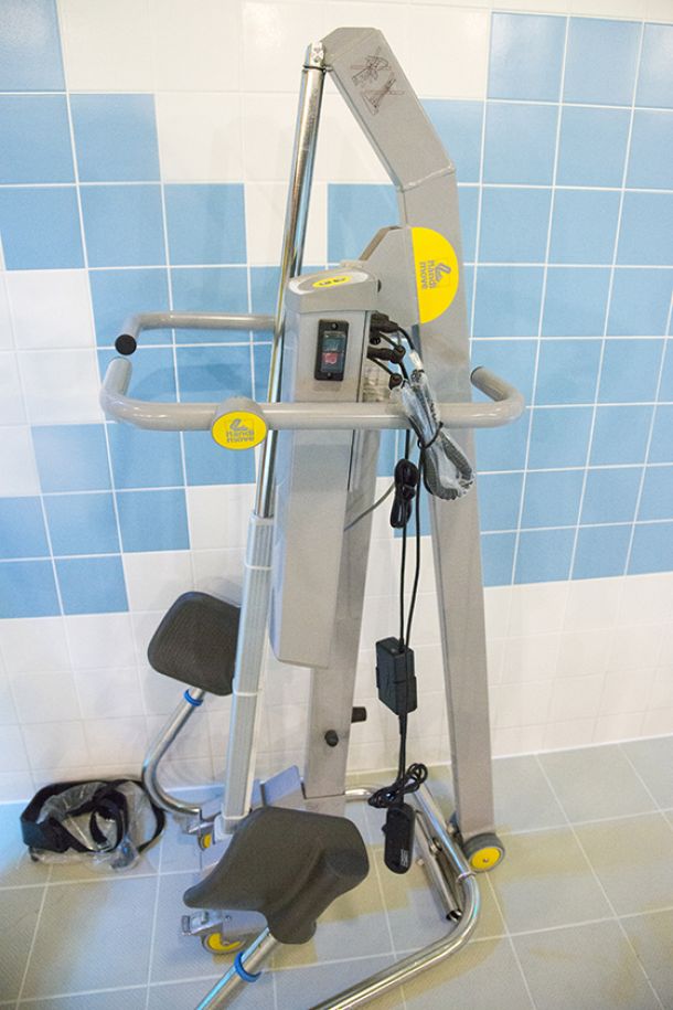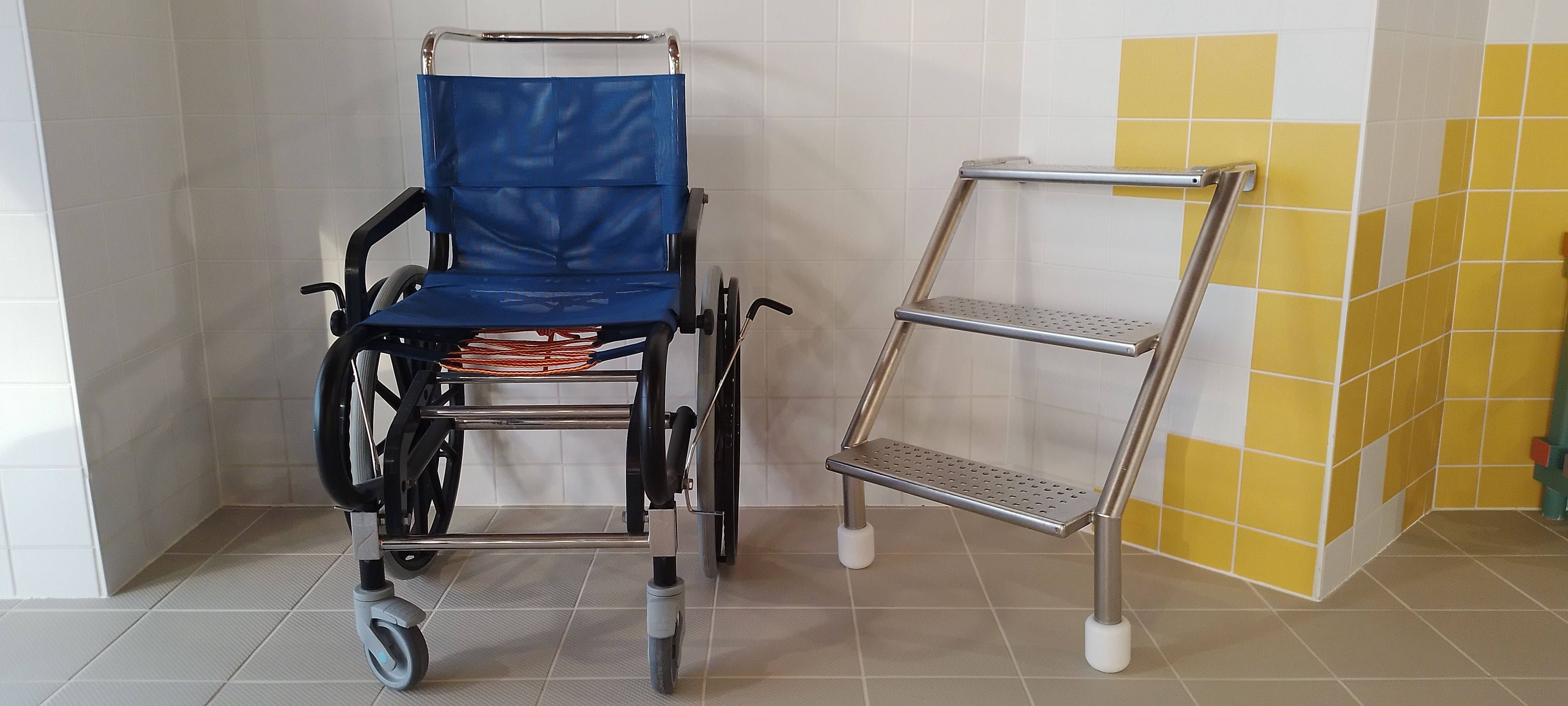 Wij beschikken over een zwembadrolstoel waarmee je zelfs onder de douche mag. Er is schuin in- en uitstapladdertje voor mensen die het wat moeilijk hebben met de gewone laddertjes. Het wordt o.a. geplaatst bij het seniorenzwemmen.