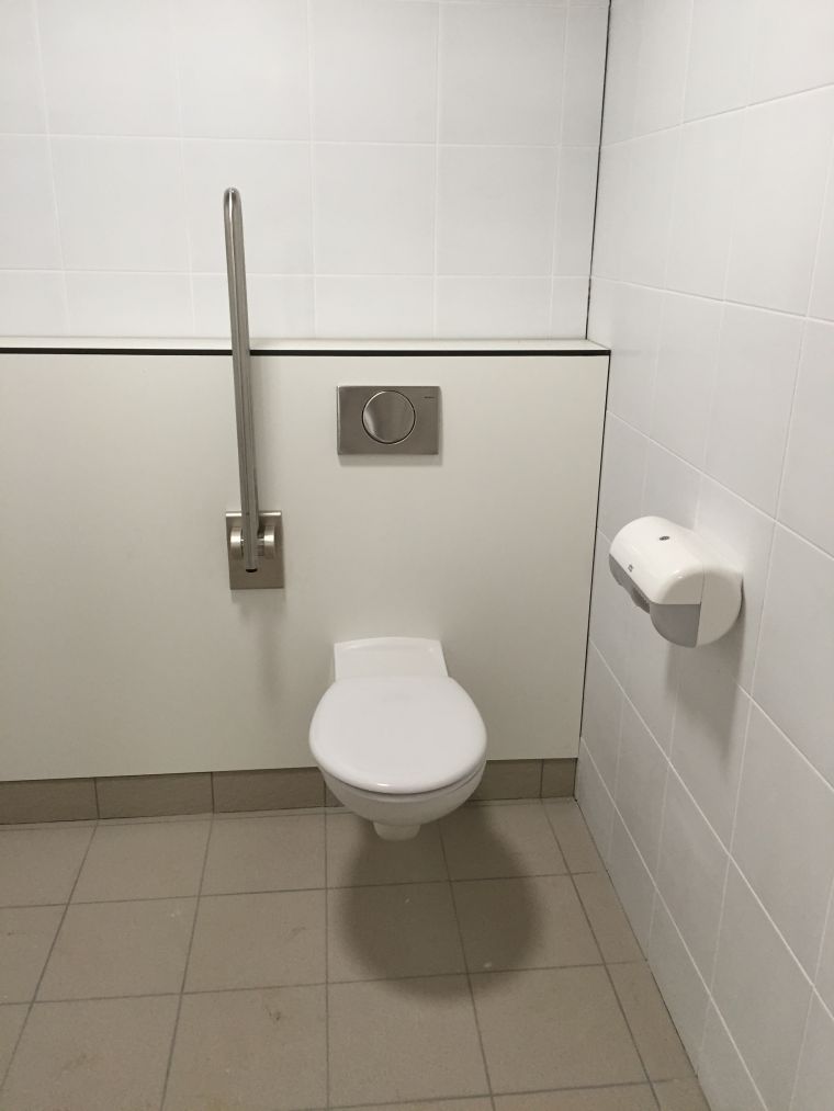 Extra groot toilet voor mensen met een rolstoel in de toiletruimte voor zowel de bezoekers als de zwemmers.