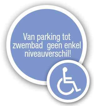 We hebben er voor gezorgd dat er van de parking tot aan het zwembadwater geen enkel niveauverschil is. Daarnaast werden ook nog volgende maatregelen genomen om de site zo toegankelijk mogelijk te maken voor personen met een handicap.